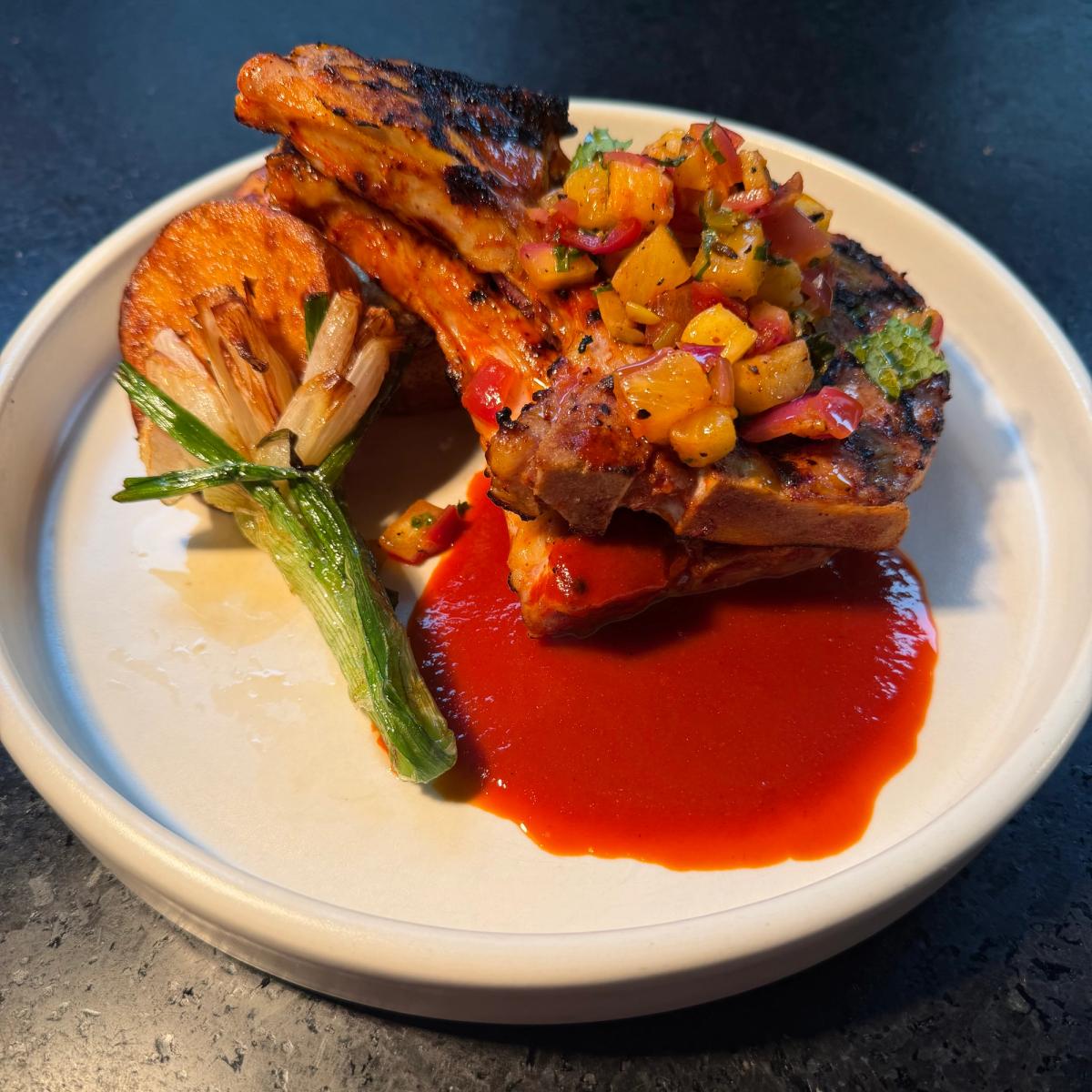 Al pastor–marinated pork chop served with pineapple serrano salsa, tajín potatoes, and Mexican onions.