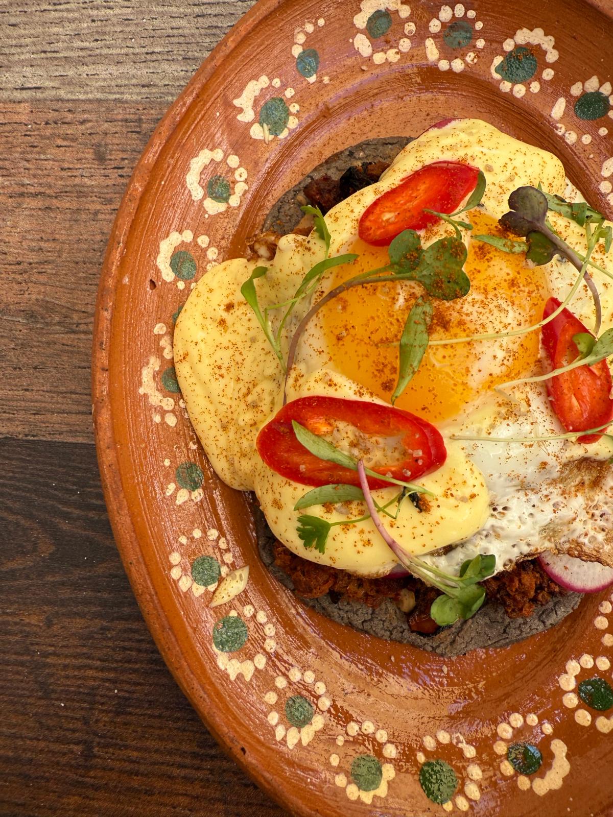 A vibrant take on eggs Benedict featuring house-made beef chorizo, sunny egg, hollandaise, fresno chiles, beans, and micro cilantro on an heirloom blue masa huarache.